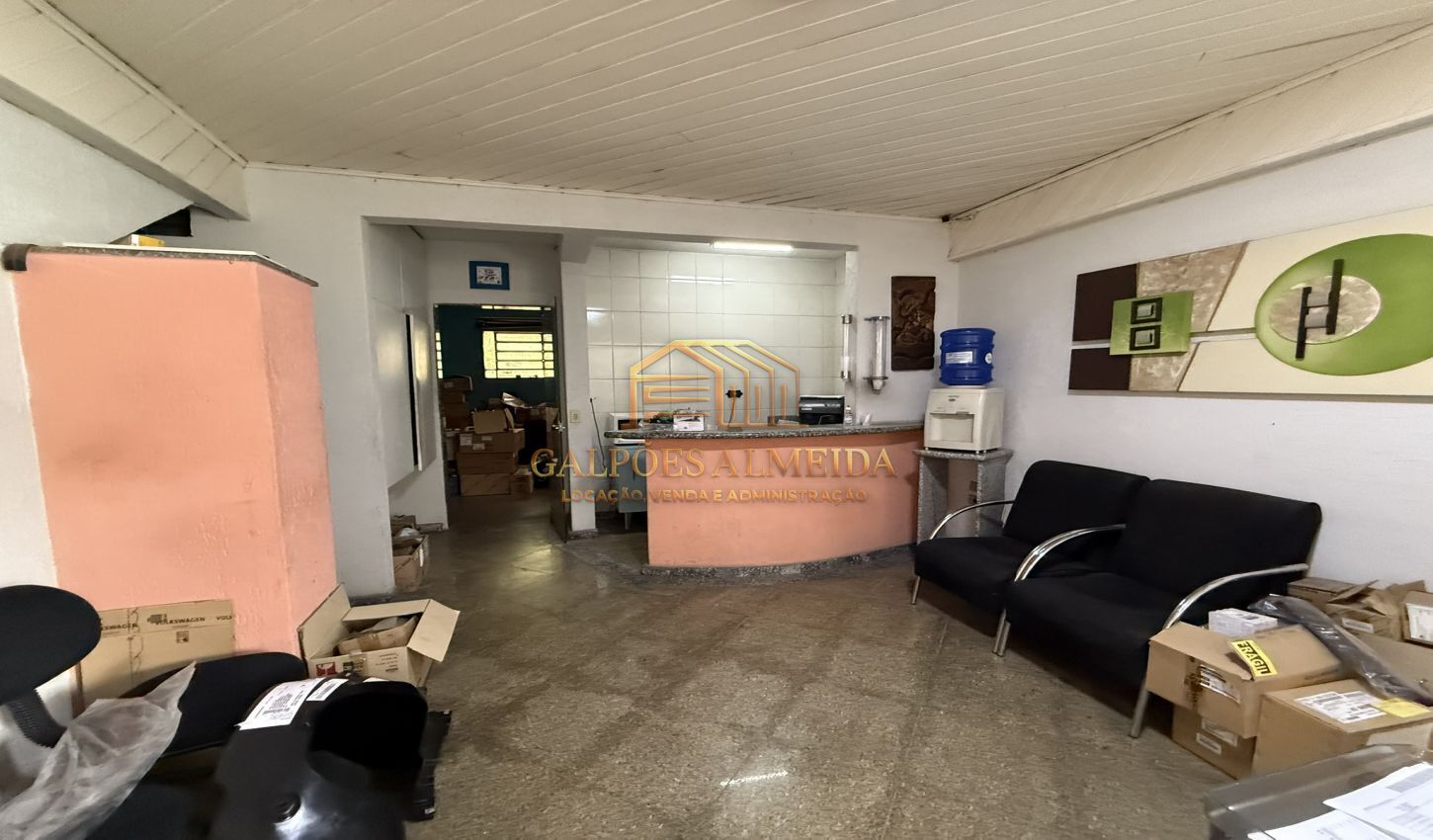 Área escritório: mezanino vão livre - recepção - 4 salas - copa - 2 banheiros